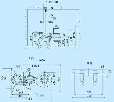 潛水泵耦合式安裝時(shí),平面的開孔需考慮潛水泵的安裝尺寸。案例中A向視圖表示了水泵的安裝孔的大小尺寸,1000×700mm。