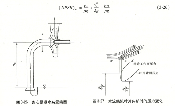 離心泵的吸水裝置在水泵運(yùn)行時(shí),由于葉輪高速旋轉(zhuǎn),在其入口處形成了真空,進(jìn)水池中的水流在大氣壓的作用下經(jīng)過吸水管流至水泵進(jìn)口,再從泵進(jìn)口流入葉輪流道,壓力沿水流減小,到進(jìn)入葉輪后,在葉片背面(即背水面)水流以相對(duì)速度W1,繞流葉片進(jìn)口邊,由于急轉(zhuǎn)彎,流速加大,在葉片背面靠進(jìn)口的K點(diǎn)處壓力降到低值,K點(diǎn)是水泵內(nèi)容易產(chǎn)生汽蝕的點(diǎn),如圖3-27所示。水泵是否會(huì)產(chǎn)生汽蝕,取決于K點(diǎn)處的壓力值,當(dāng)K點(diǎn)的壓力pk下降到等于該泵工作溫度下的飽和汽化壓力p汽時(shí),則泵內(nèi)發(fā)生汽蝕。以后,水流在葉輪中得到葉片傳來的機(jī)械能,壓力迅速上升,因此汔蝕基本方程正是表征水泵汽蝕條件與影響汽蝕諸因素之間的關(guān)系式,其表達(dá)式如下: